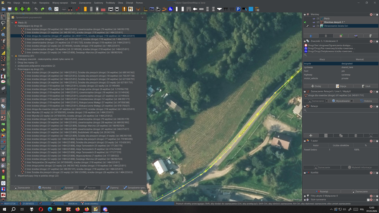 Jeżeli rysujesz jakieś ciągi piesze czy jezdne to niech one się łączą z innymi ponieważ niektóre pozostawiasz, że aż rażą w oczy a inne mają położony węzeł na węzeł, że tego nie widać ale ich połączenia nie ma. W prawym, dolnym rogu edytora masz taki pomarańczowy trójkąt z wykrzyknikiem więc zobacz czasem jakie błędy wskazuje. Narysowałeś most który tak naprawdę jest przepustem a nie mostem. Dodałeś tam bramę. Więc jeżeli droga jest prywatna to do bramy należy todać access=private. Korzystaj z dokumentacji bo dobrze, że dodajesz jakieś "paczkomaty" ale sporo znaczników w nich brakuje. Zastanów się czy chcesz edytować na wspólnej mapie jaką jest OSM stosując się do wytycznych i nie dokładać niepotrzebnej pracy innym czy uprawiać własną twórczość bo dla indywidualistów są inne miejsca.