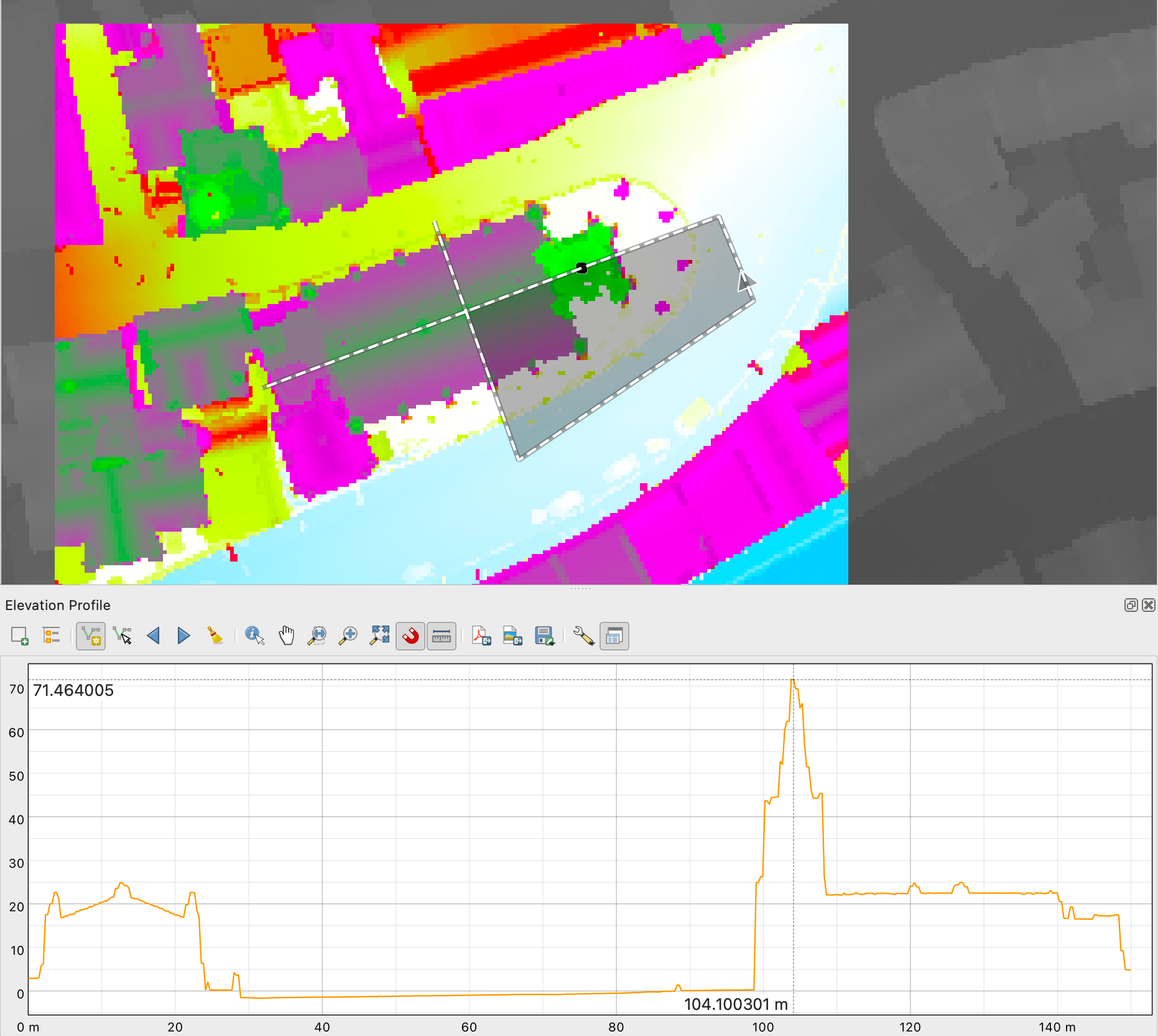 The elevation profile tool in QGIS proved useful for exploring the LiDAR data (after I worked out how to right-click to confirm the path). I normalised the elevation to zero with the raster calculator and set a custom colour ramp to aid visualisation: